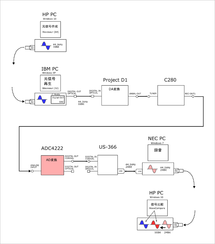 1.HP-PCで、Wavosaur (64) にて44.1kHz、16bit のテスト用信号を作ります。