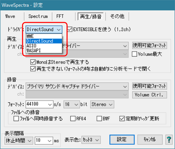 たとえば、Wavespectraの「再生/録音」タブで、ドライバを開くと以下のようなドロップダウン