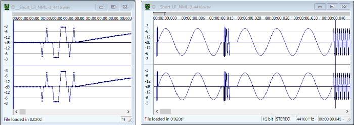 ・左側は先頭部、20サンプル分ゼロが続いた後ちょっと意地悪な波形を挿入してあります。